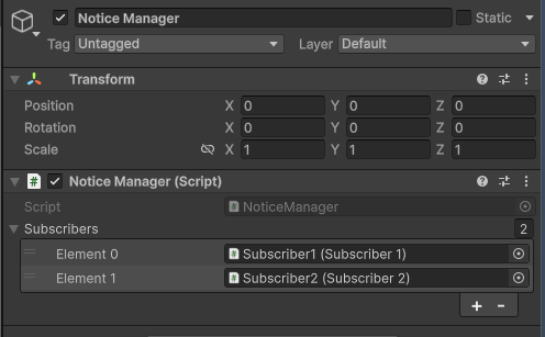 Debug.Log($"공지사항: {message}, Subscriber2");