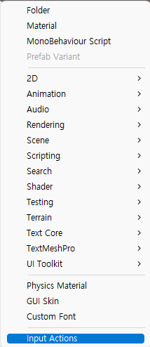 키를 등록하기 위해서는 먼저, Project 창에서 오른쪽 마우스를 클릭하고 Create -> Input Actions을 클릭해 줍니다.